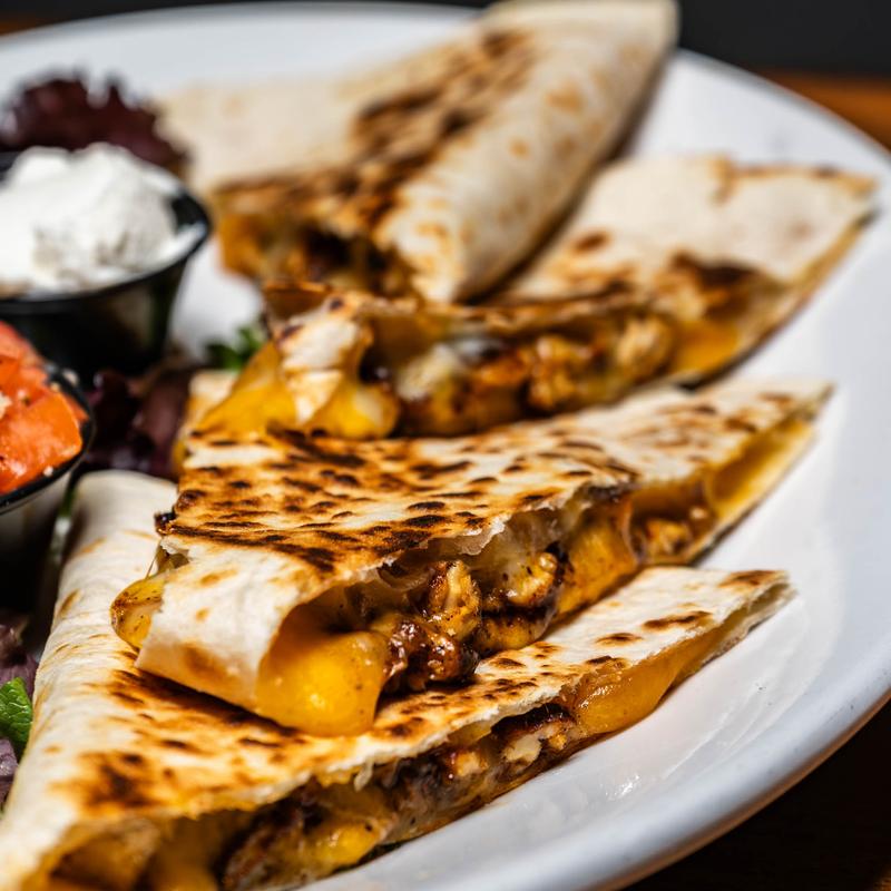 12-inch flour tortilla stuffed with melted Monterey Jack & cheddar cheese served on a bed of greens with pico de gallo and sour cream • Grilled chicken $18.00 | Blackened chicken $18.00 | Buffalo chicken $18.00 | Braised short rib $19.00 | Seared sirloin $19.00 | Philly Cheesesteak $19.00