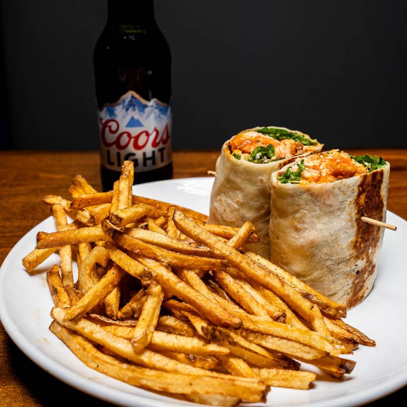 Crispy fried chicken breast tossed with buffalo sauce, chopped lettuce, and blue cheese. Wrapped in a flour tortilla. Served with house-cut fries.