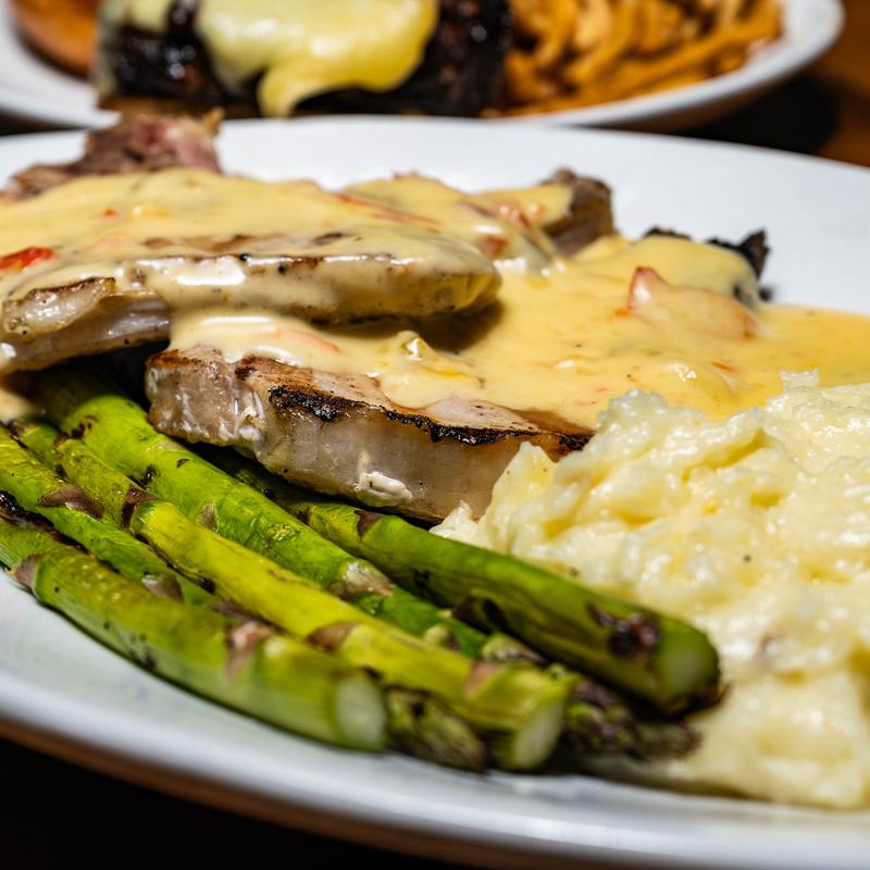 Two 8 oz center-cut pork chops topped with sliced hot cherry pepper white wine butter sauce. Served with mashed potatoes and grilled asparagus.