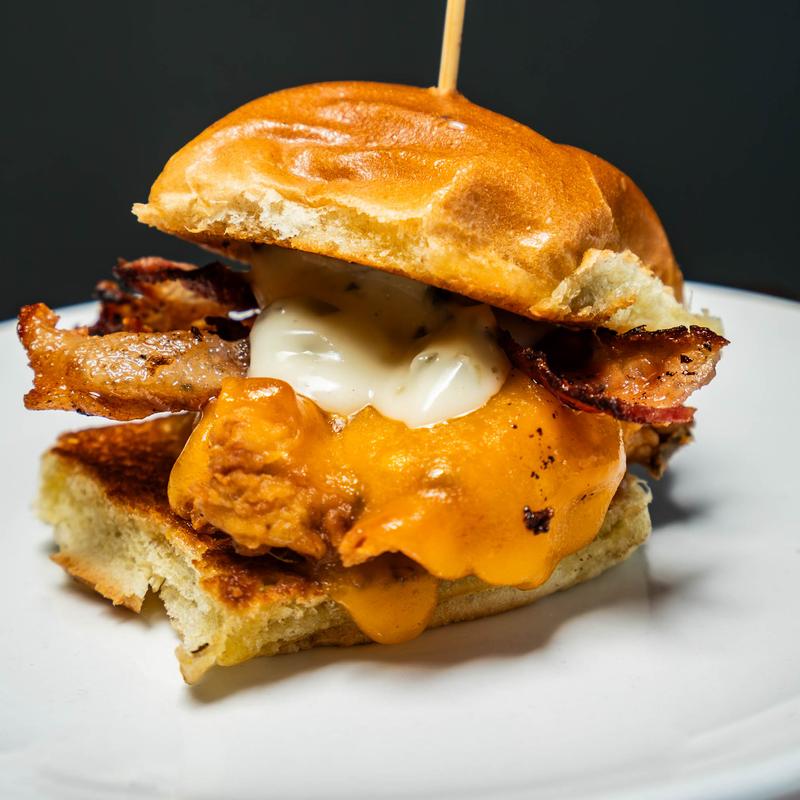 8oz beef patty topped with cheddar cheese, crispy bacon strips, and a sunny-side-up fried egg with chipotle aioli. Served with house-cut fries.