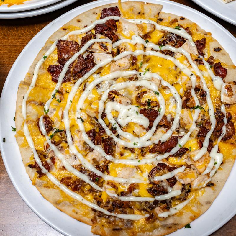 Ranch dressing, melted Monterey Jack & cheddar cheese, grilled chicken, crispy bacon bits.