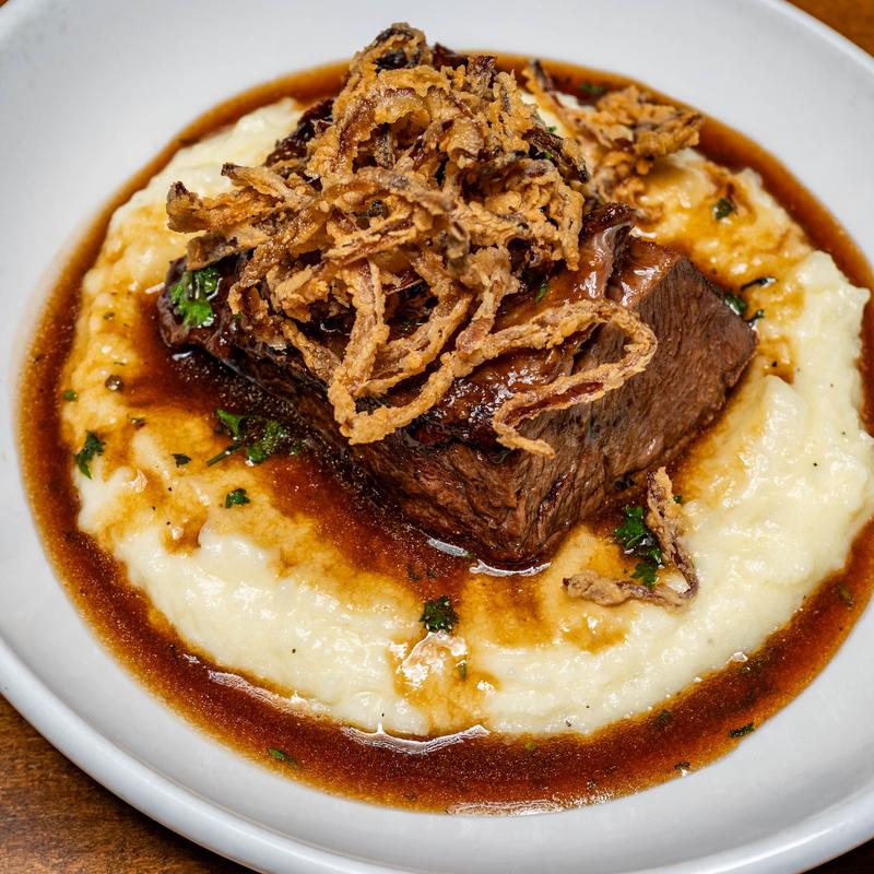 5-hour braised boneless short rib over roasted garlic mashed potatoes. Topped with gravy and frizzled onions.