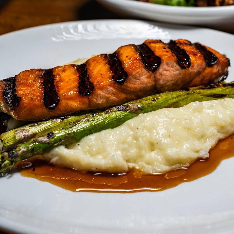 Topped with hot honey glaze over mashed potatoes and grilled asparagus.