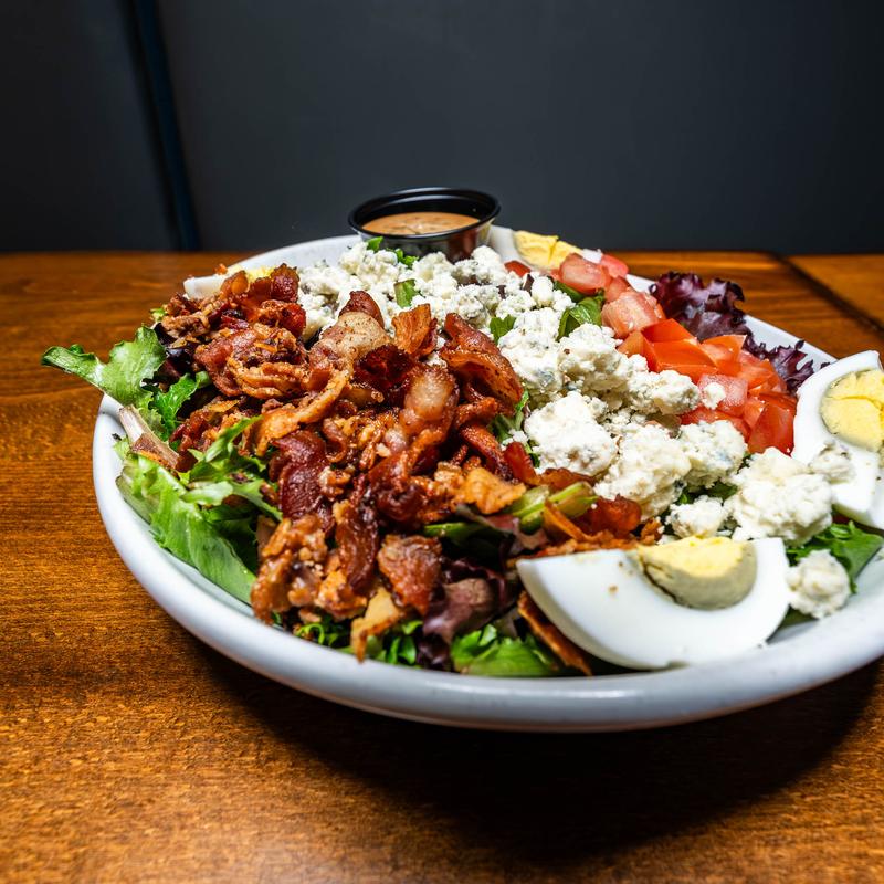 Mixed greens topped with chopped tomato, crispy bacon bits, hard-boiled eggs, and crumbled blue cheese.